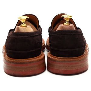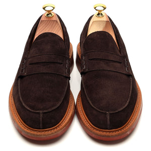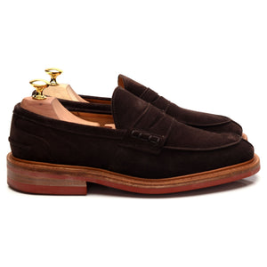 Tricker's 'James' split toe penny loafer in dark brown 'Coffee' Castorino suede. In excellent used condition.