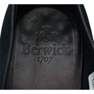 Berwick '4951' Belgian tassel loafers in black suede. In excellent used condition, showing minor signs of wear.