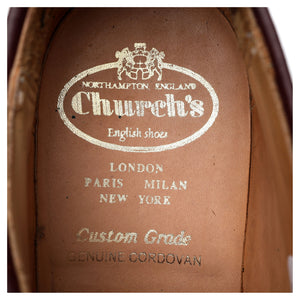 チャーチの「グラフトン」ダービーブローグ、バーガンディ色のコードバン製。中古品ながら良好な状態です。