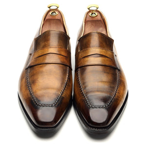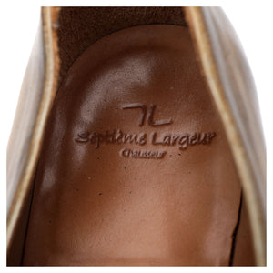 Septième Largeur 'Miro' penny loafer in tan brown patina calf. In excellent used condition, showing minor signs of wear.